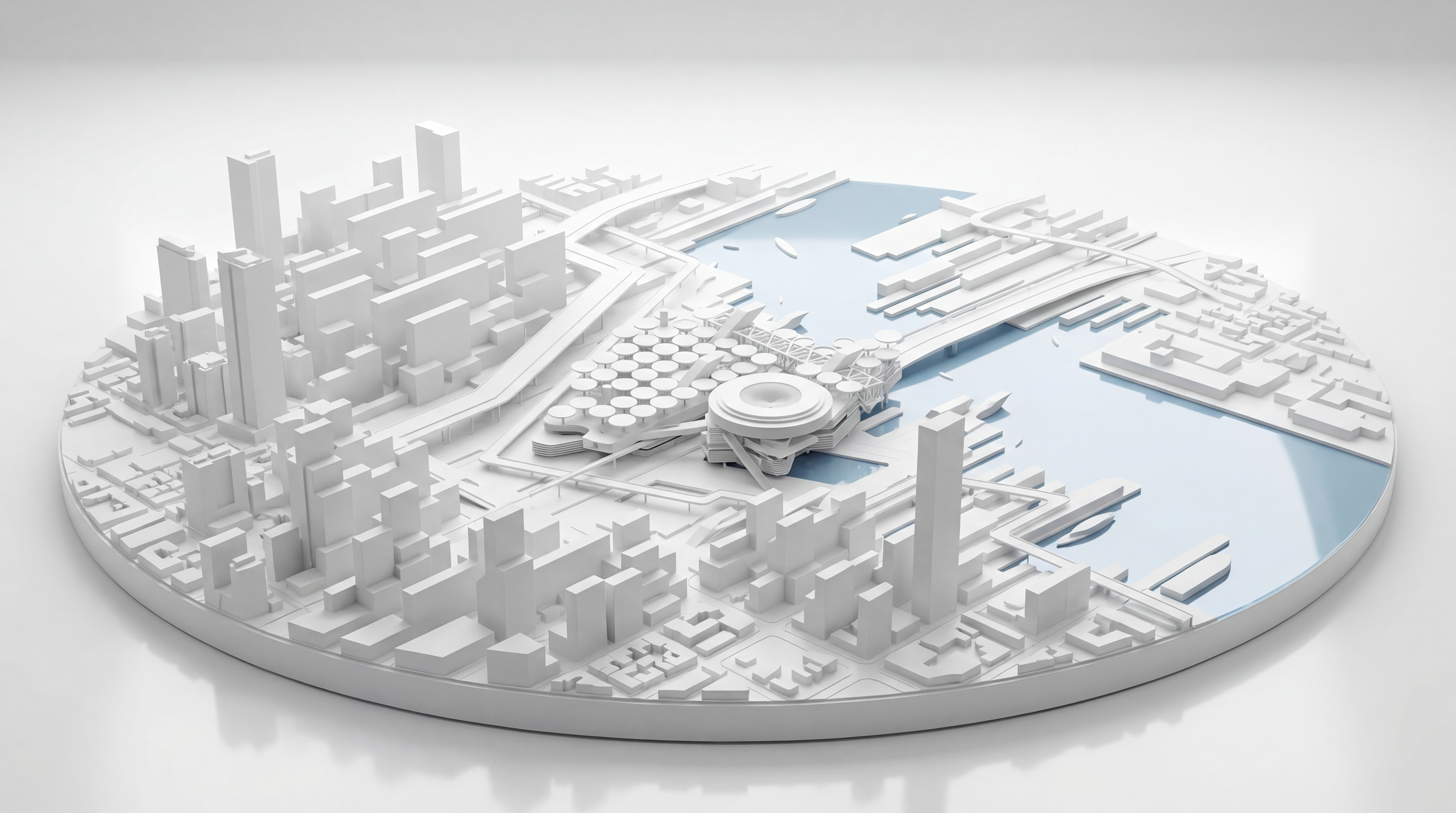 The Xiong'an Convention Center is located at the center of the Central Financial District, directly accessible via six different modes of transportations. [ pedestrians, automated vehicles, passenger drones, boats, subway line and light rail line ]