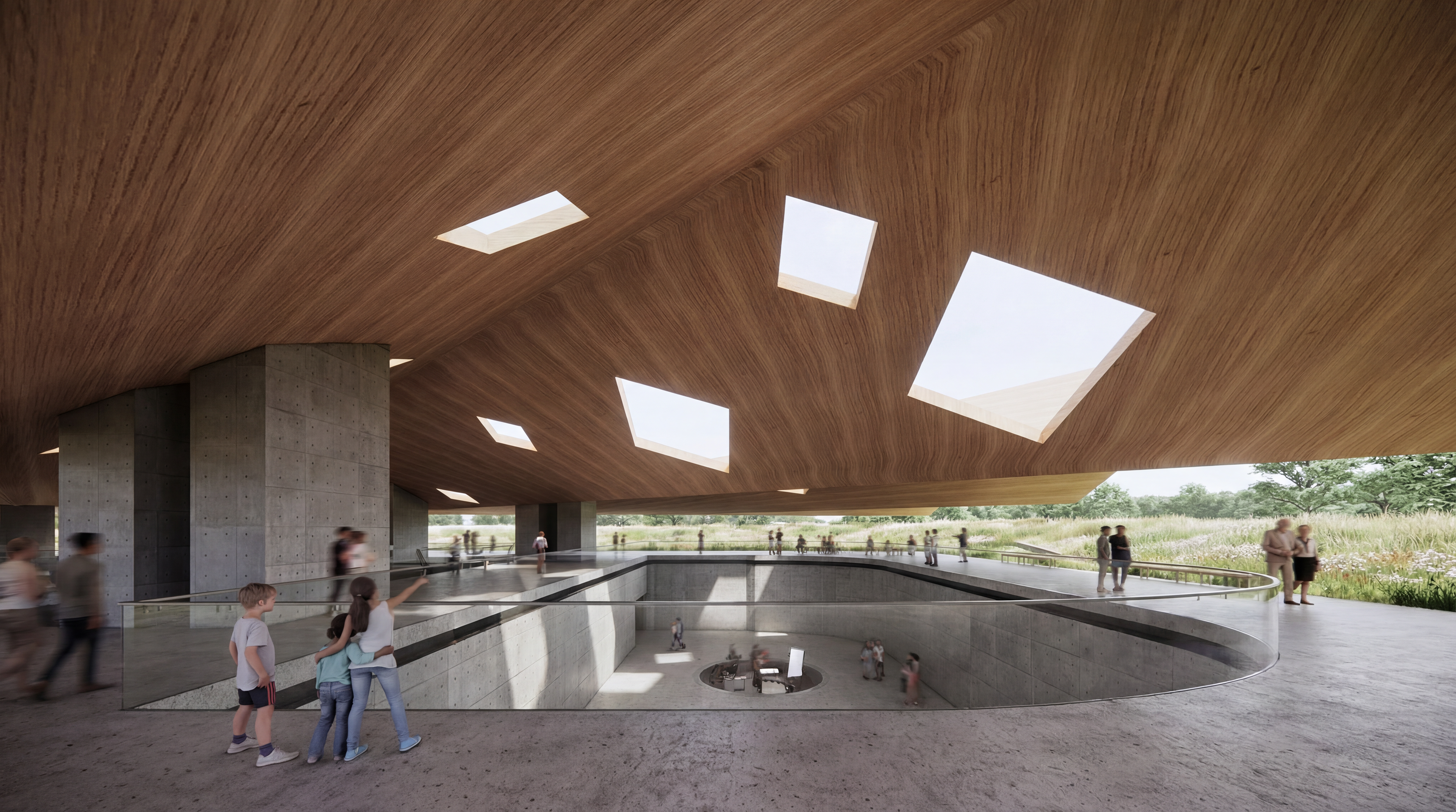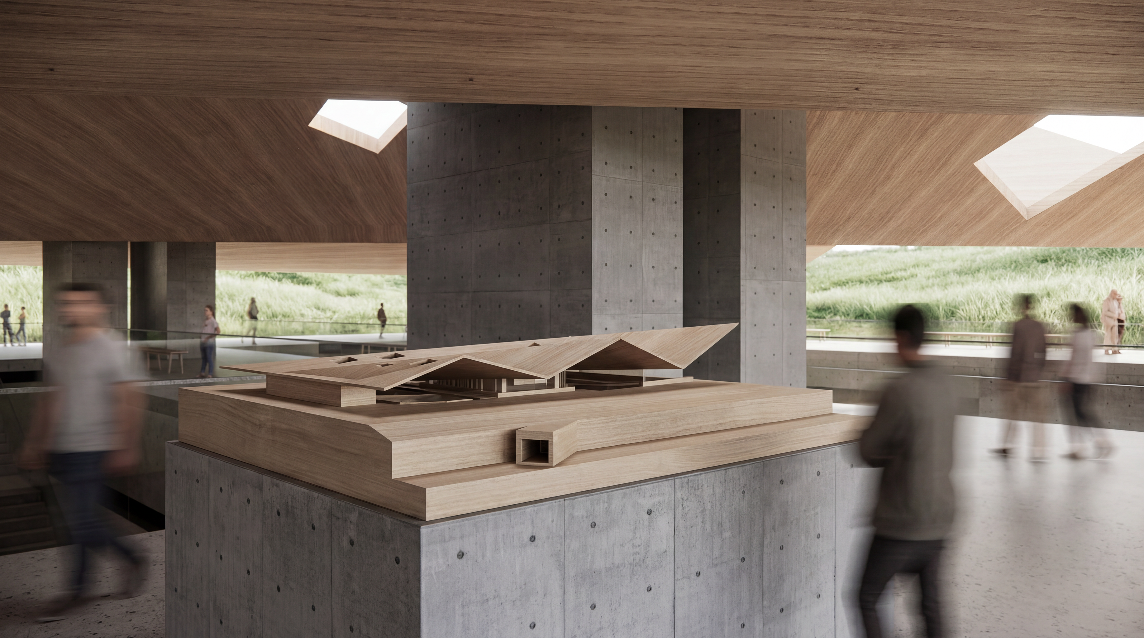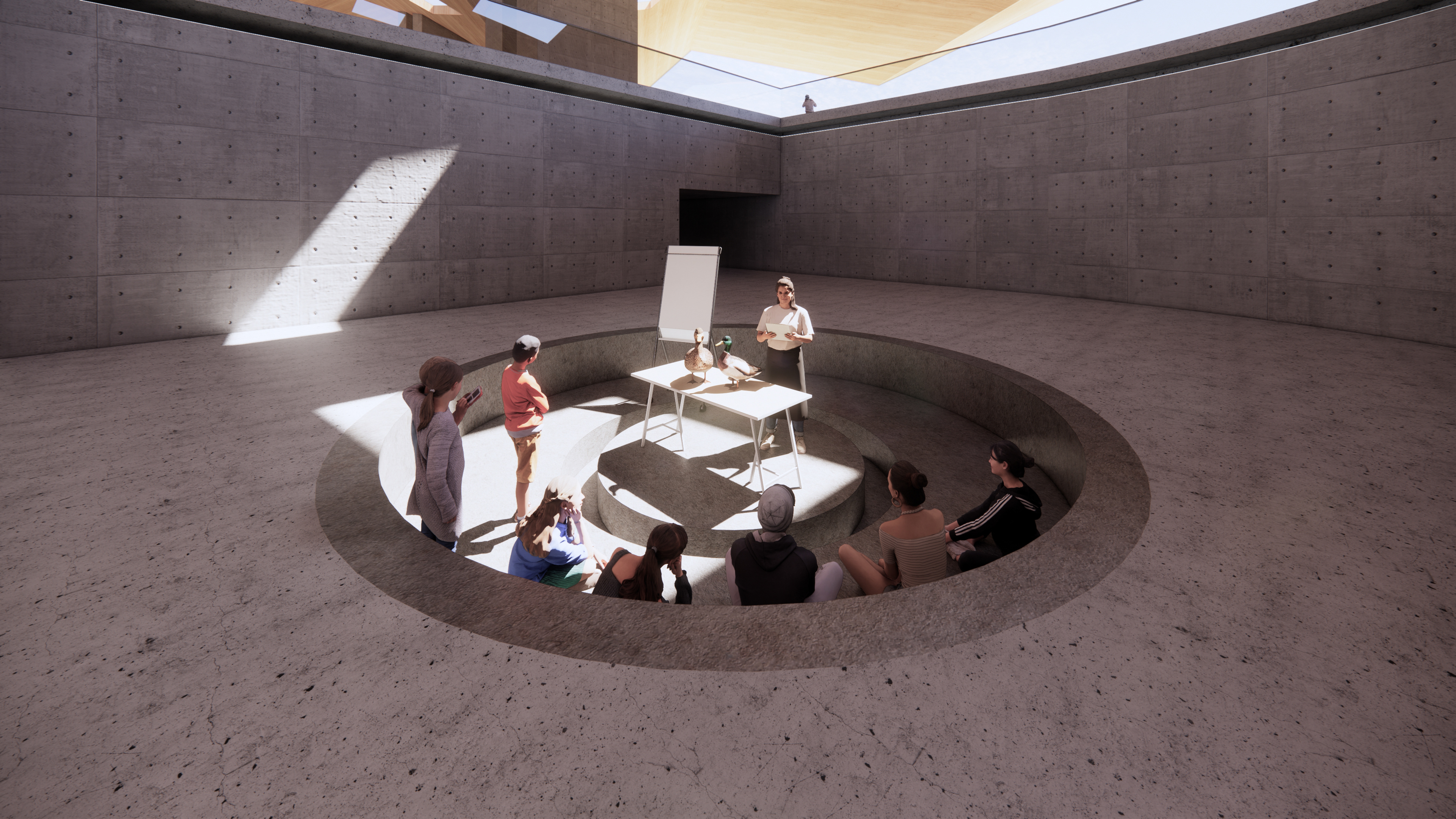 The Le'Ahi Wetland Nature Center is part of a larger proposal that reintroduces the wetland ecosystem into the Diamond Head Crater, previously militarized by the United States Military during the early 1900s. The restored wetland will provide habitats for endemic species of water birds, migratory birds and various species of vegetation. The wetland nature center will be a crucial actor in this newly established network, where it serves as a platform for the education and advocacy of its natural history. The building sits atop the old Battery Birkhimer while the military structure is repurposed into classrooms and galleries. The juxtaposition of the old military structure and the new education facility reinforces the importance of knowledge and preservation over colonial infrastructure. The pitched roof of the facility also frames the view of the Le'Ahi Peak, where the visitors could have the most optimized view of the crater.
