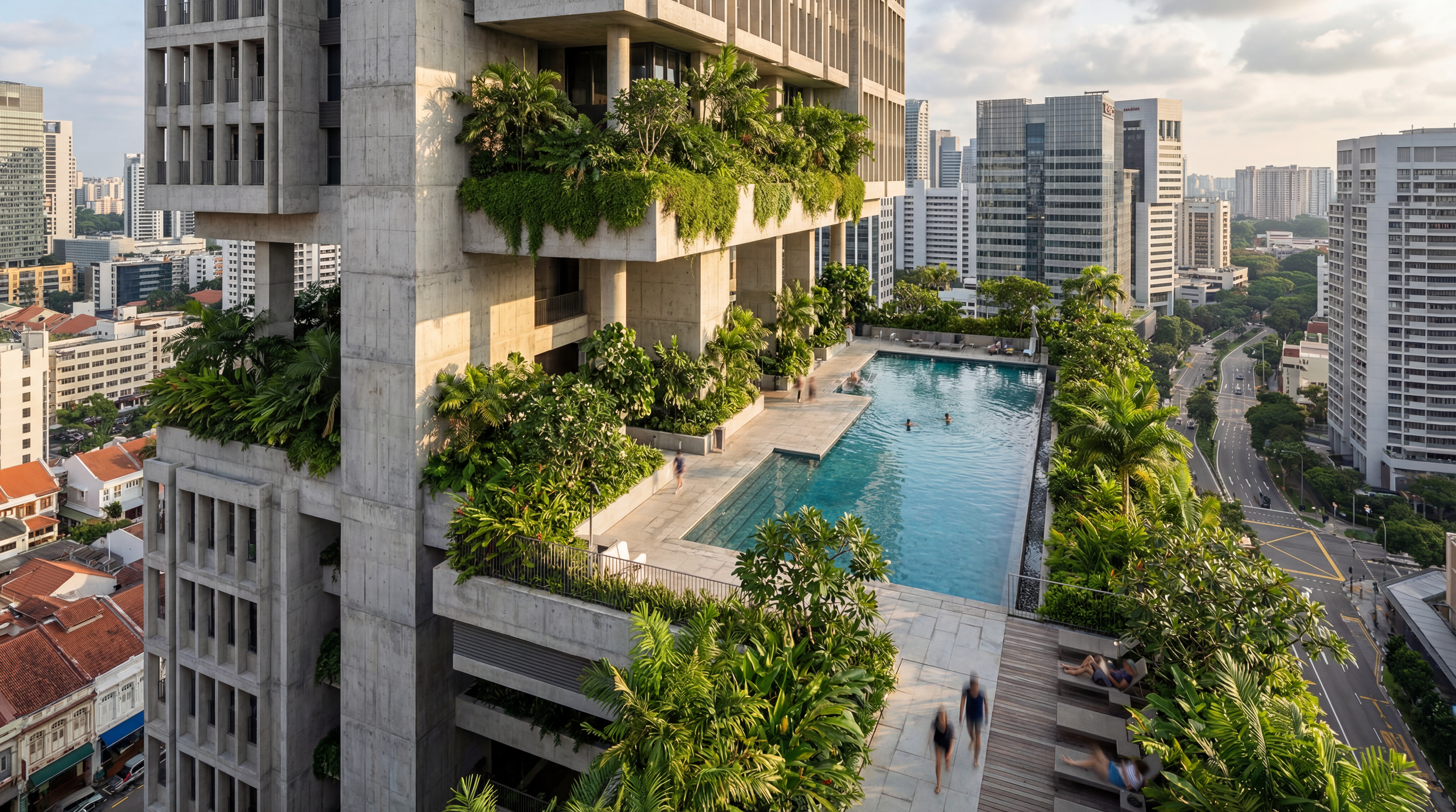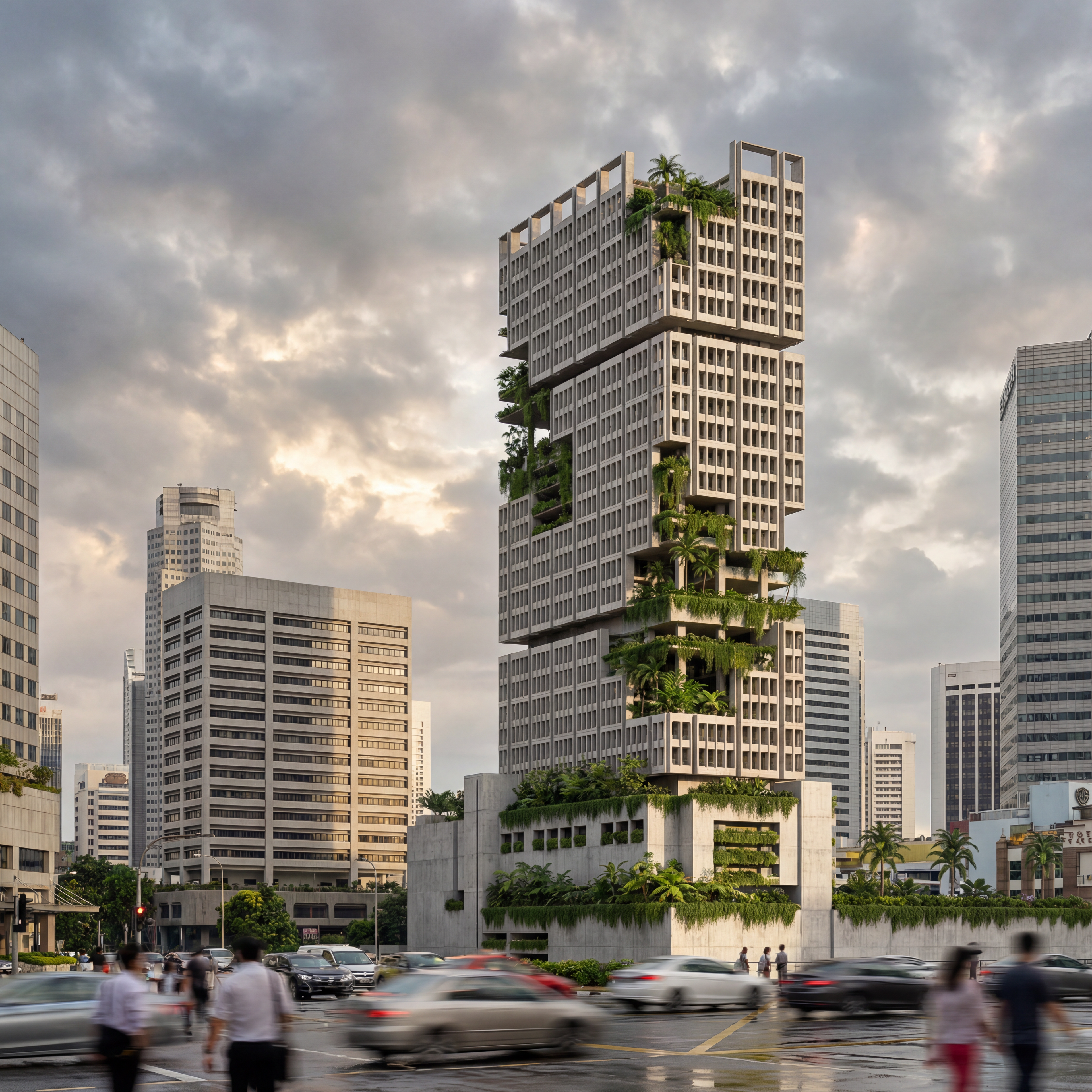 The goal for the project is to implement Lush, a new code emphasizing the integration of green and sustainable features in architecture. The strategy here is to create a tropical jungle, as if the tower was a ruin emerging out of the trees. With the idea of converting the building into a luxury hotel, existing precast concrete facade panels were strategically removed, revealing open terraces and gardens. Double height spaces allowed for taller vegetation along with better airflow and lighting into the building. Sustainable features such as solar panels and rainwater collecting system were also integrated, with the latter filling up the pools. The podium level is now clad with vertical green walls and the underused parking lots serve as the rain water tanks storage. The reimagined Shaw Tower introduces a new ecosystem into urban Singapore, bridging life and nature.