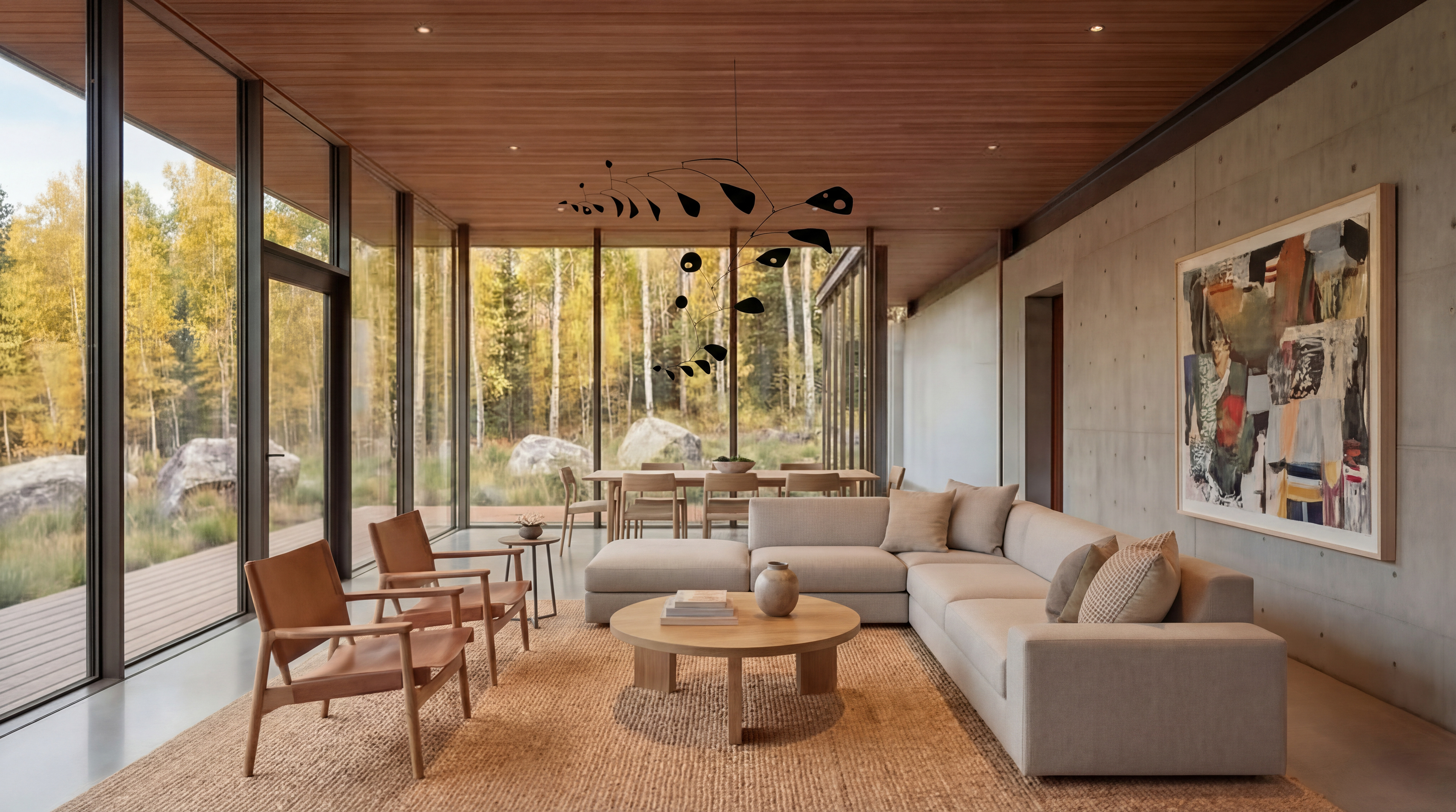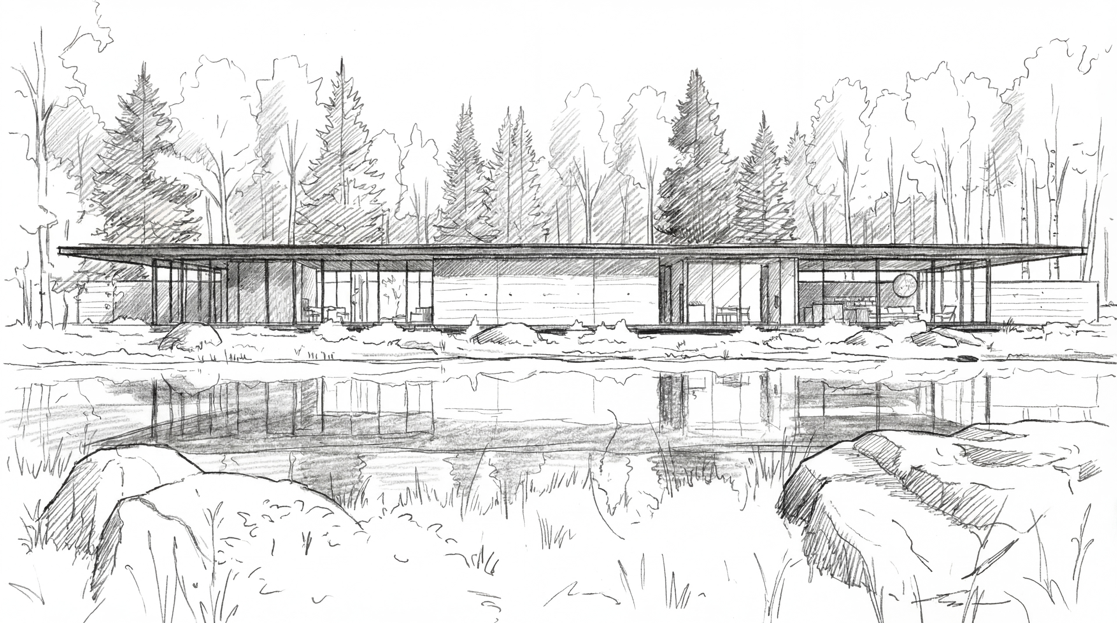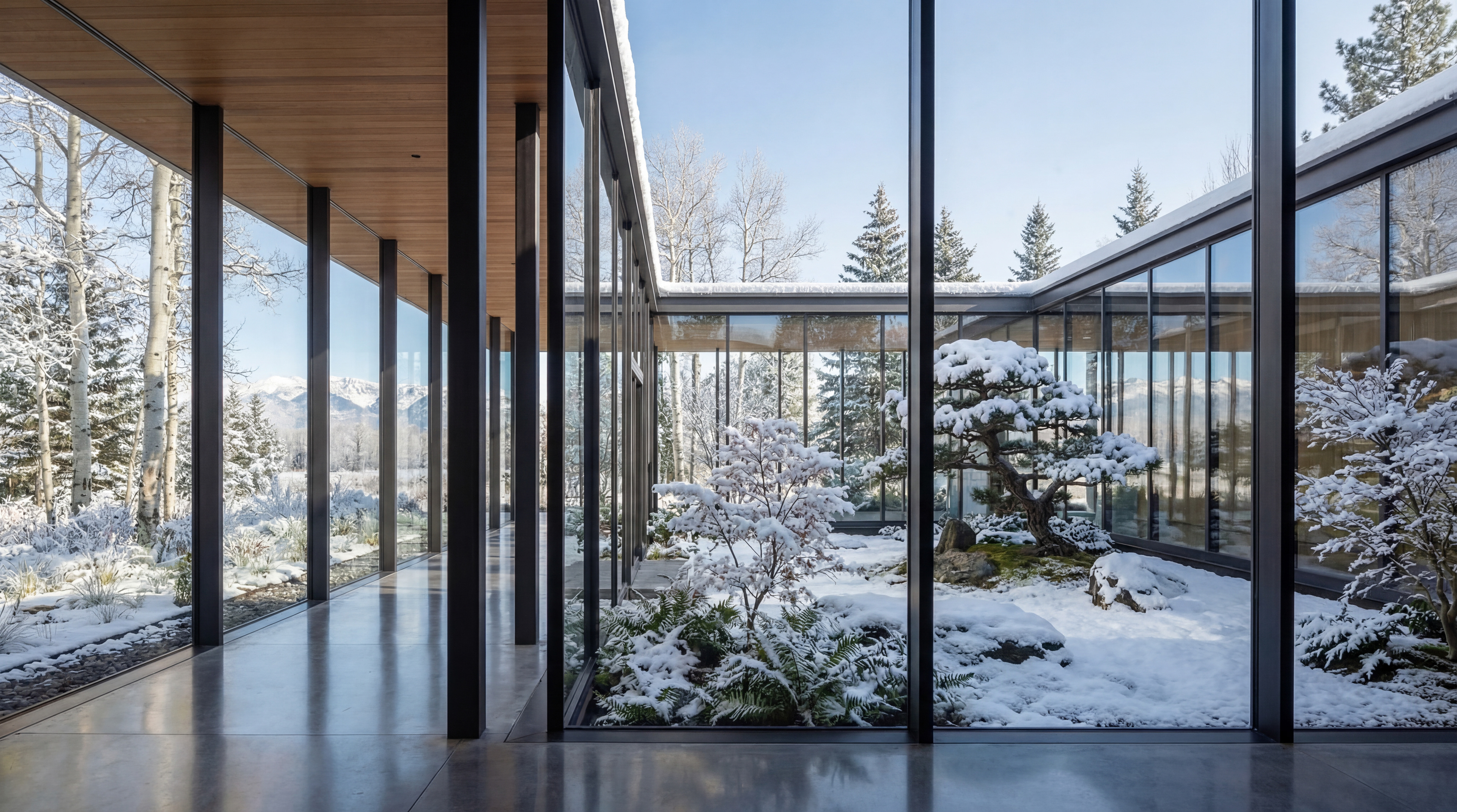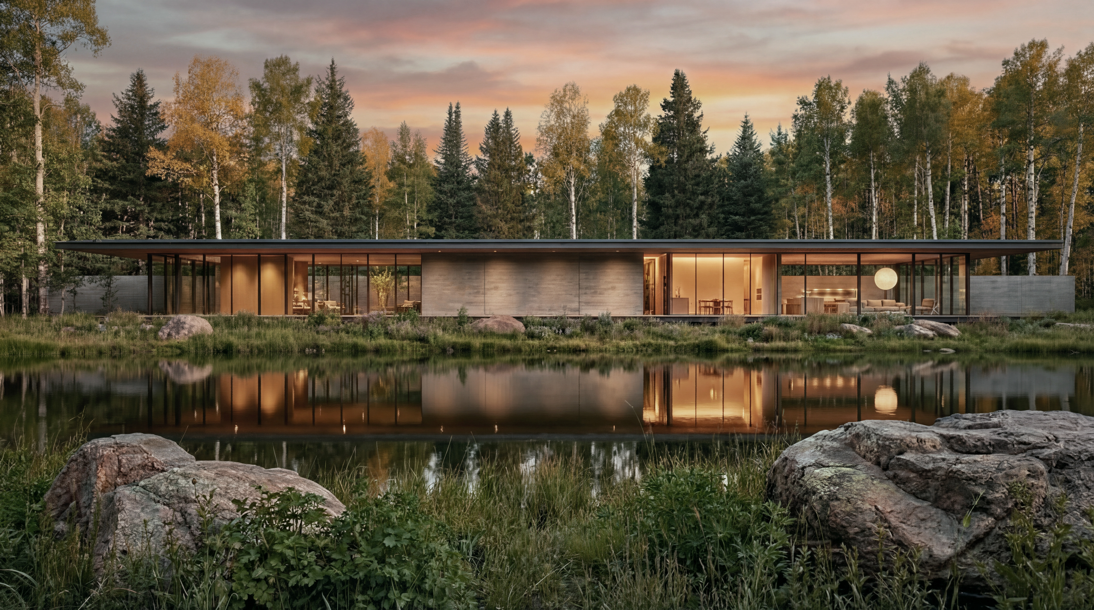 A low-profile roof plane extends outward to create deep overhangs, moderating Montana’s seasonal extremes while framing long views toward the surrounding mountains and forest canopy. Floor-to-ceiling glazing dissolves the boundary between interior and exterior, allowing light, landscape, and changing seasons to define the living experience. The home is organized as a series of interconnected pavilions, balancing openness with moments of privacy and refuge.