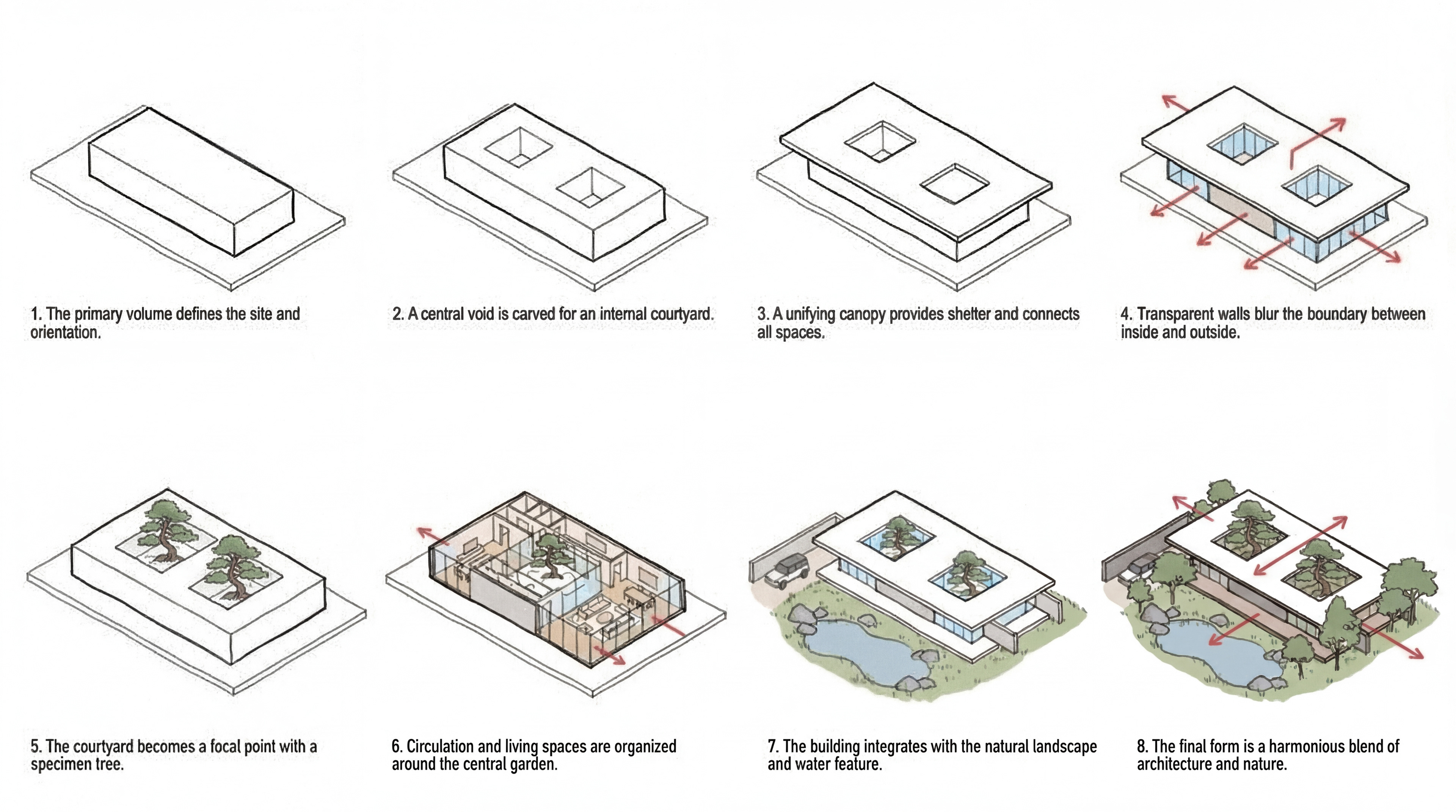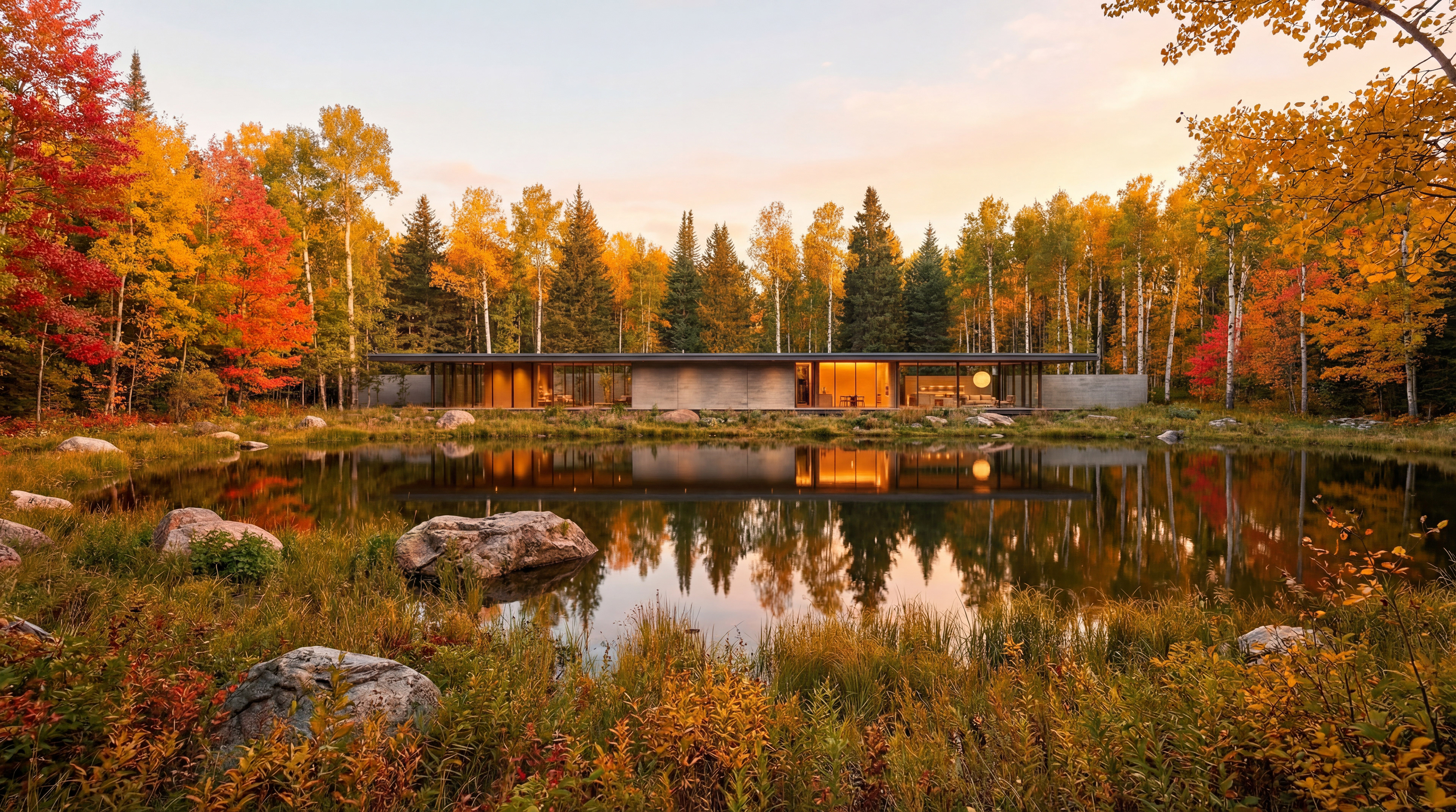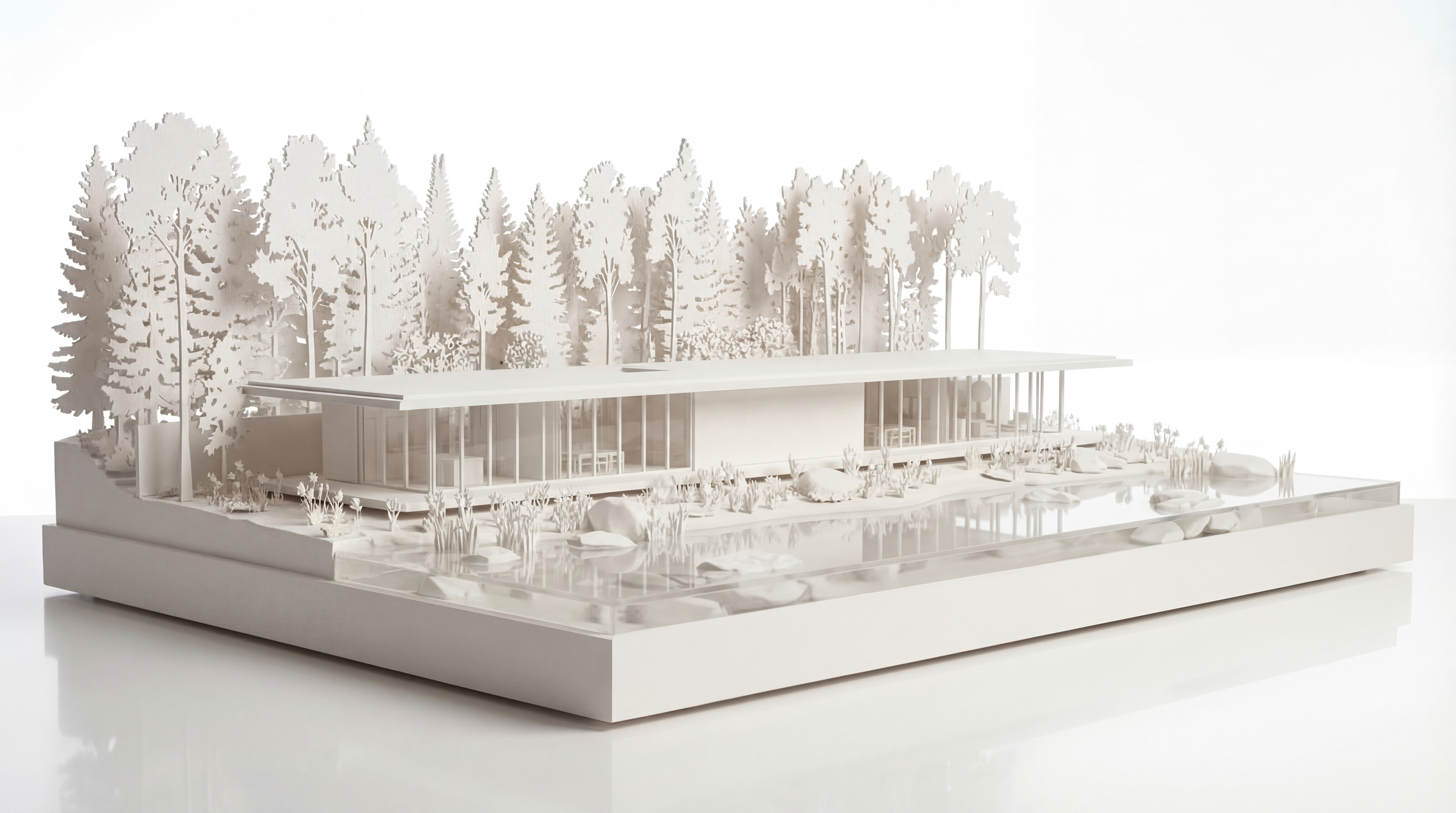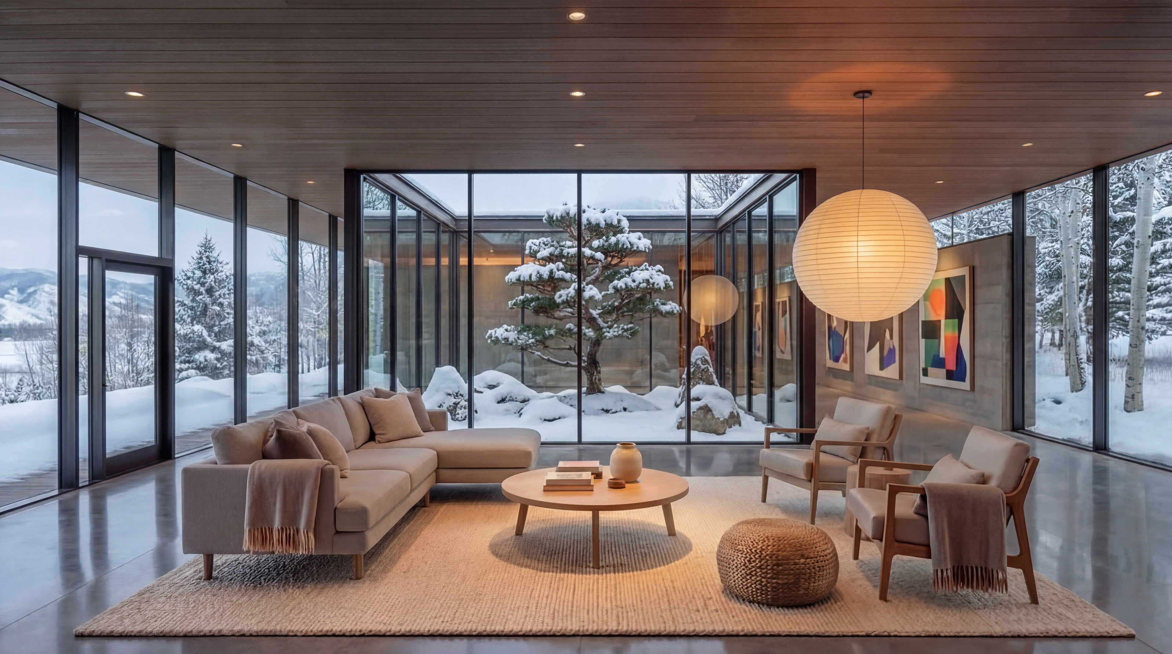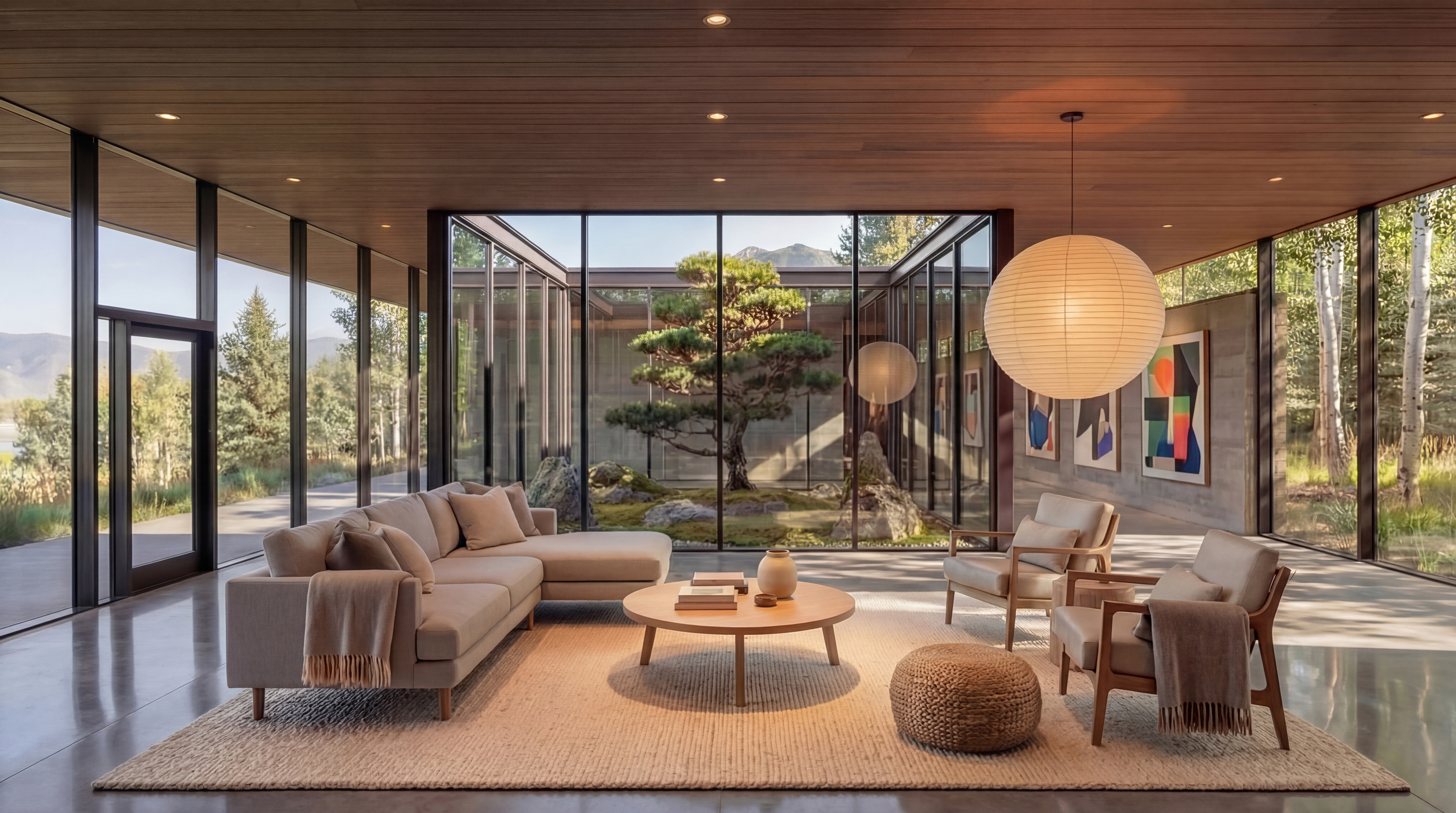 A low-profile roof plane extends outward to create deep overhangs, moderating Montana’s seasonal extremes while framing long views toward the surrounding mountains and forest canopy. Floor-to-ceiling glazing dissolves the boundary between interior and exterior, allowing light, landscape, and changing seasons to define the living experience. The home is organized as a series of interconnected pavilions, balancing openness with moments of privacy and refuge.