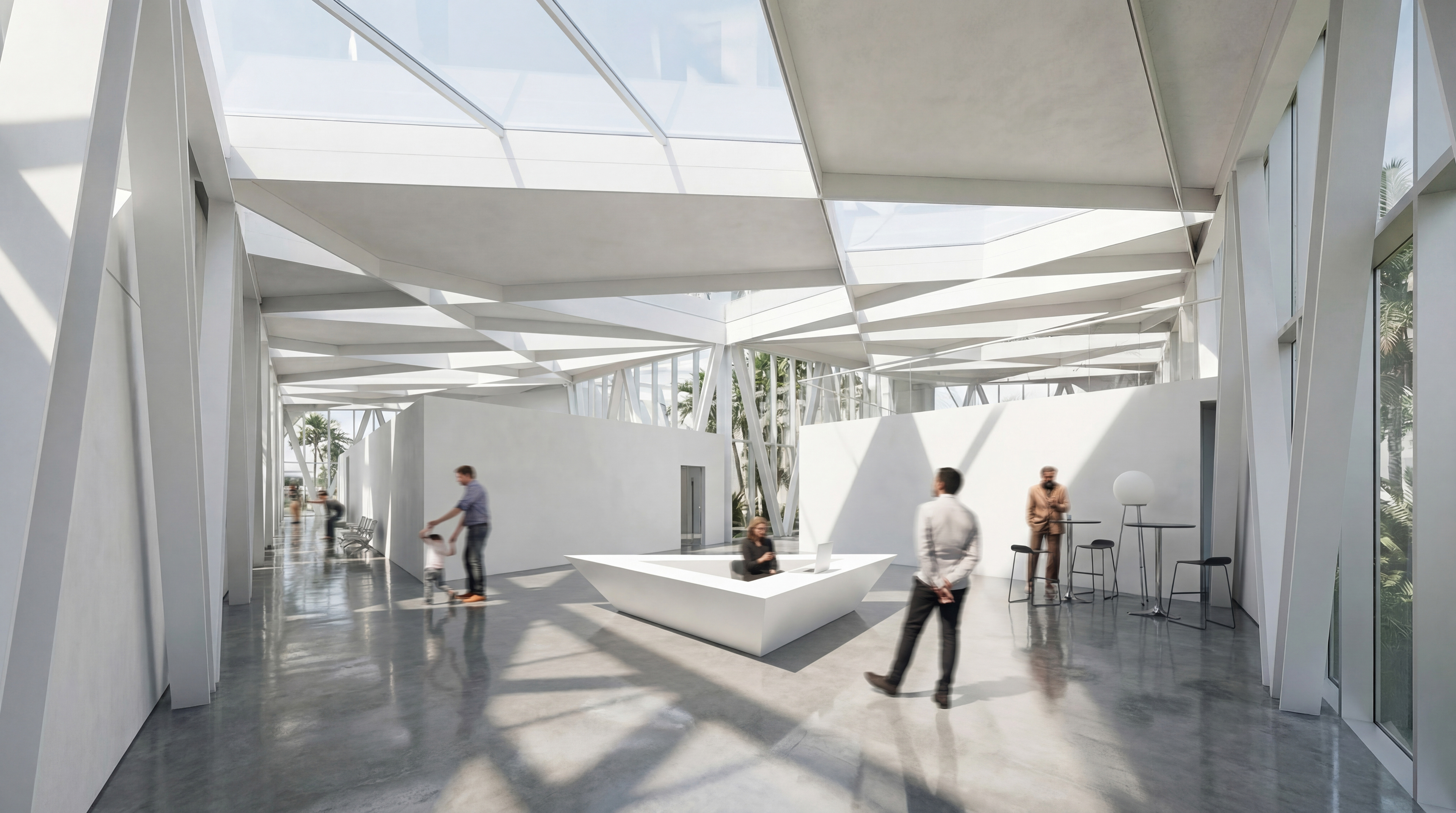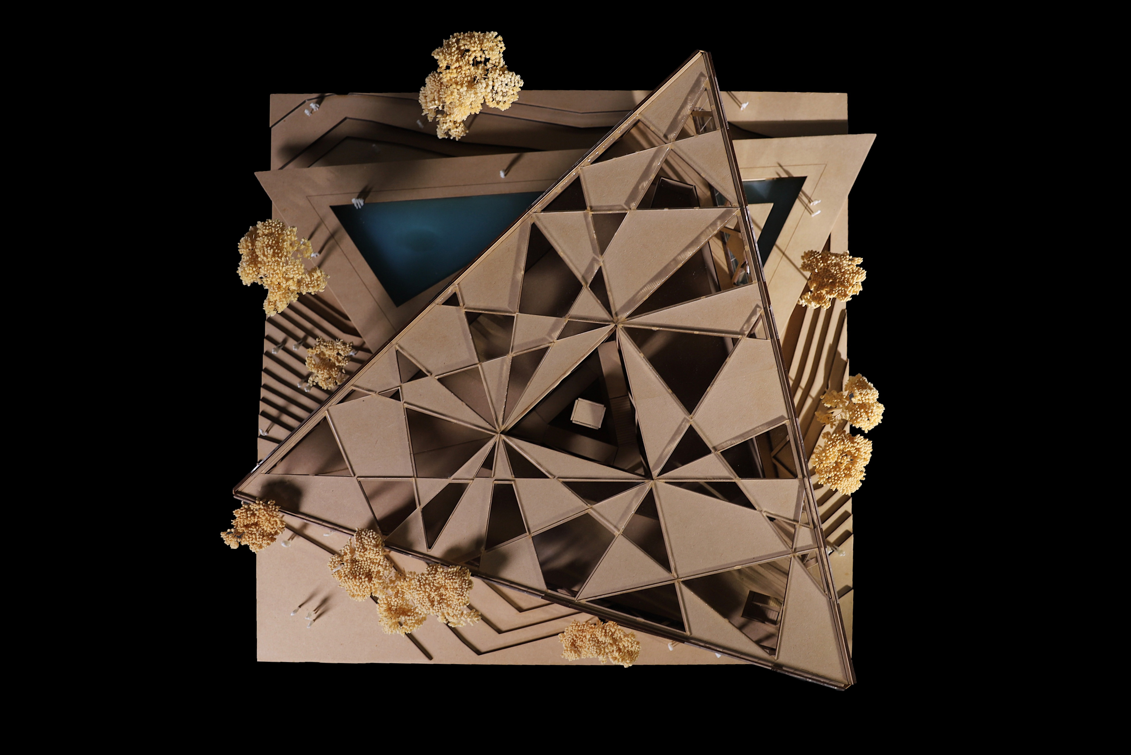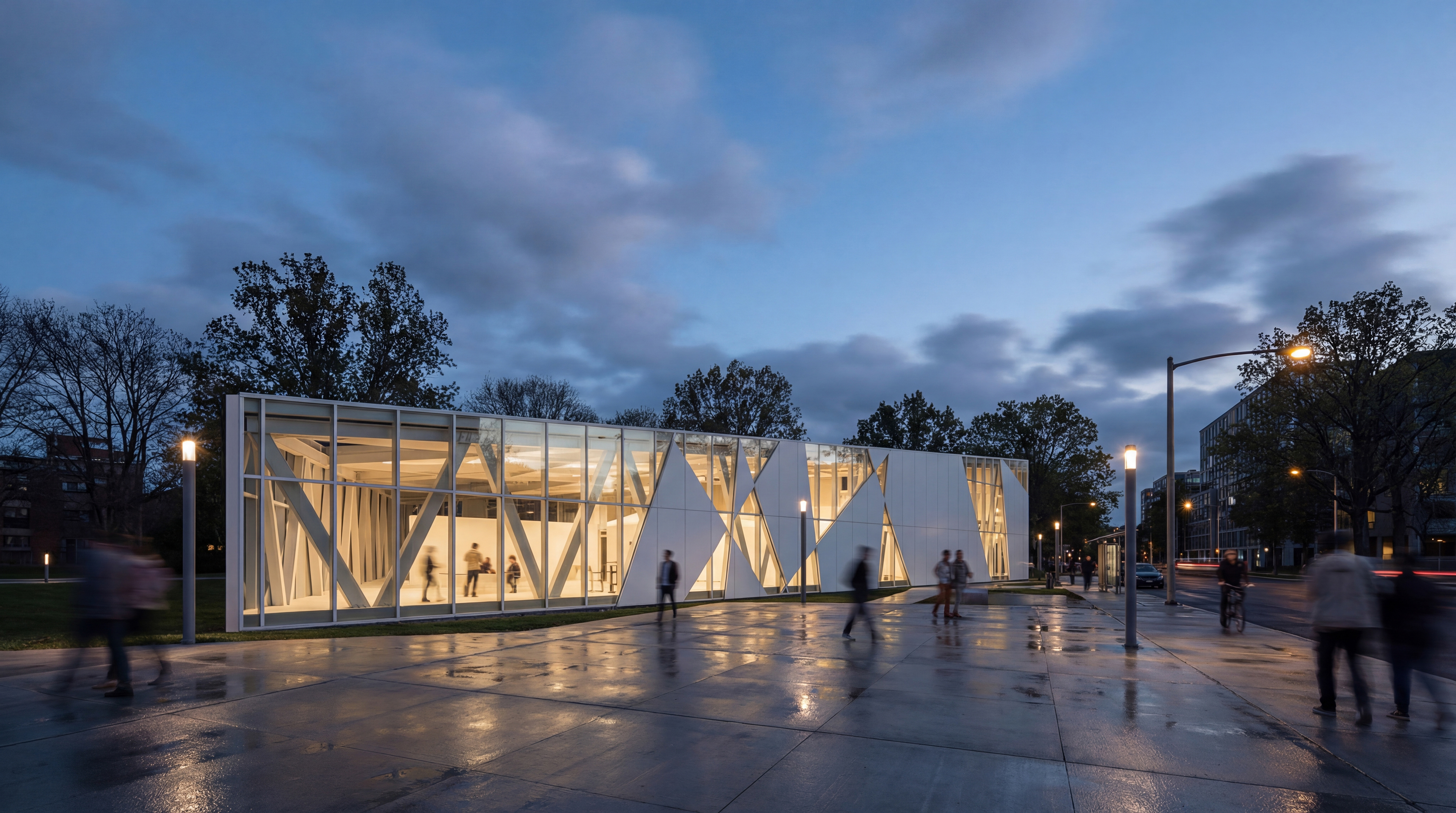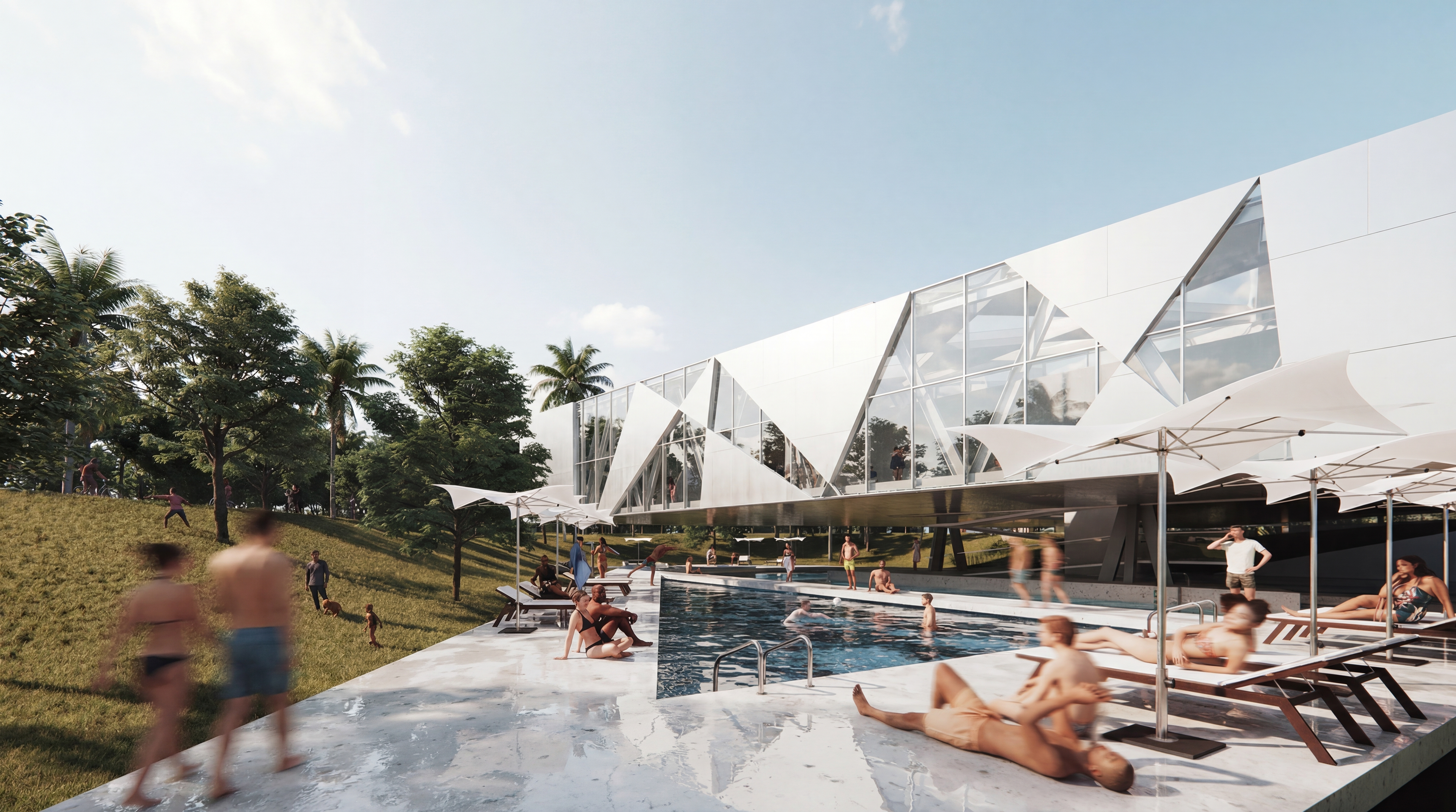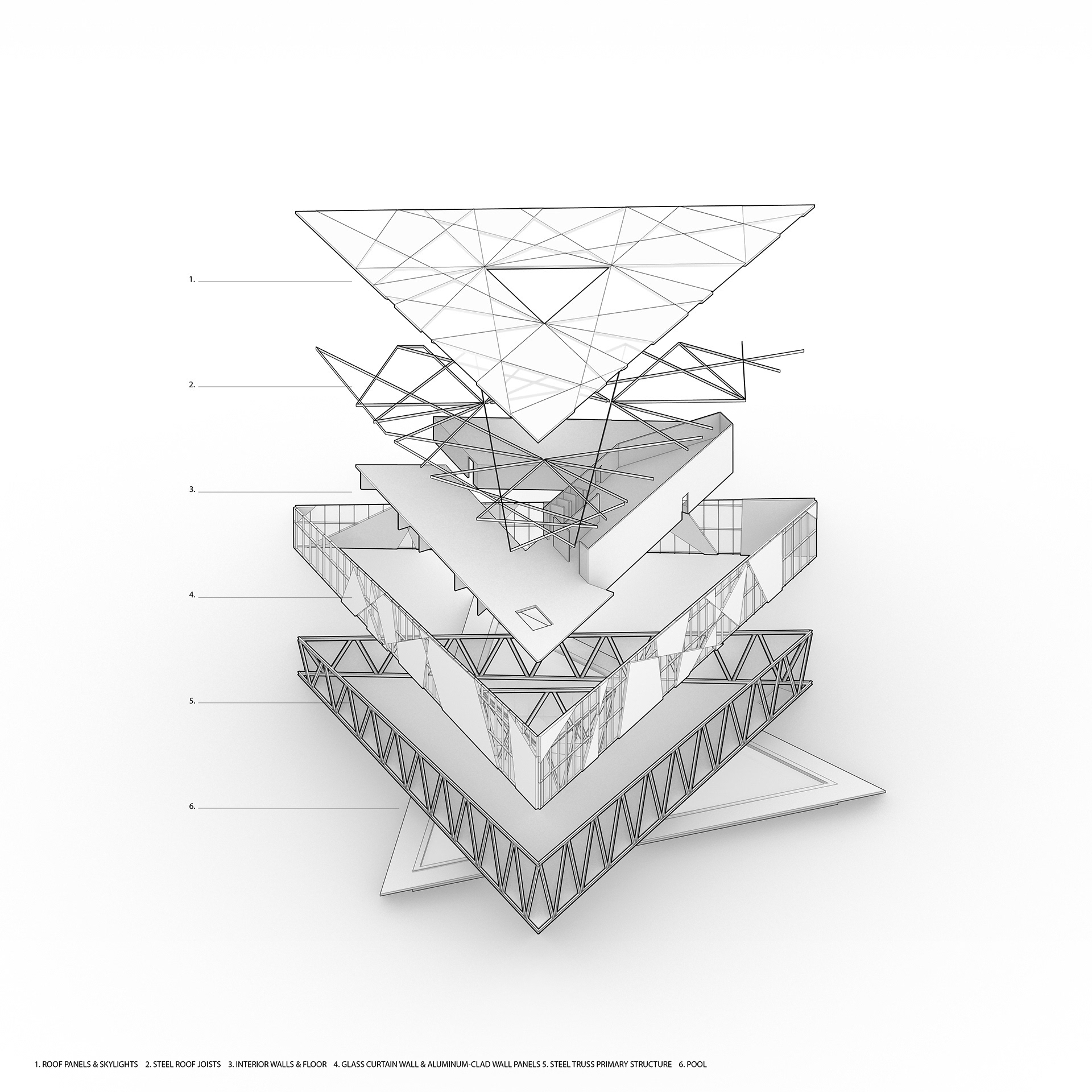 Located in Westchester Park of Los Angeles, adjacent to the Otis College of Design and vast residential areas, the project serves as a new focal point to the existing community.Inspired by a prism, the overall form of the building is a triangle, with a steel frame primary structure. Trusses were utilized in order to provide stability and strength for the building which cantilevers over the pool. The building envelope system, mimic the refraction of light through a prism, consists of fragmented geometries turned skylights, glass curtain walls and aluminum panels. Continuing the same design language, the pool also takes the form of a triangle, orientated in a different angle from the building, creating interesting lighting moments and spatial qualities.