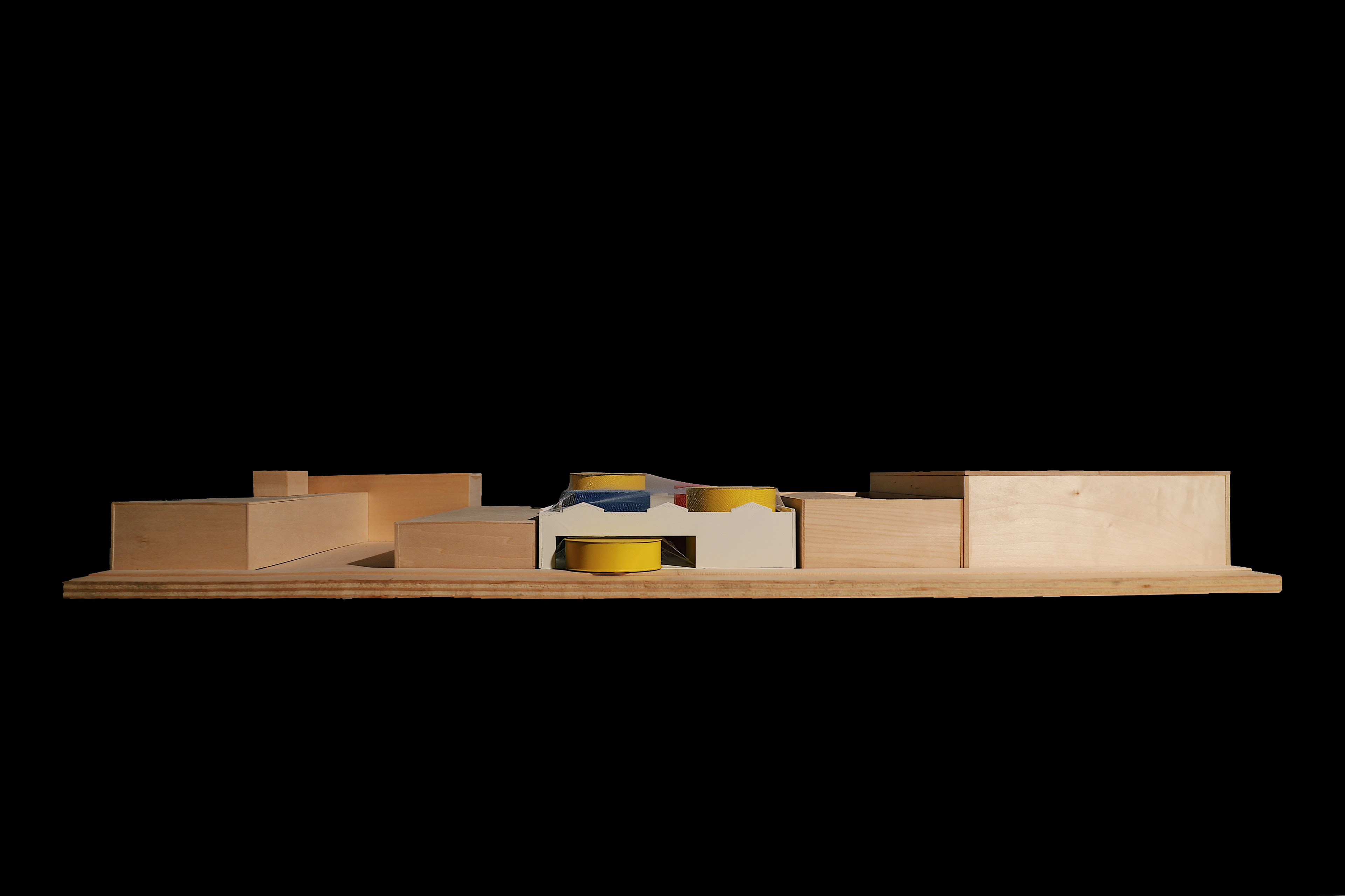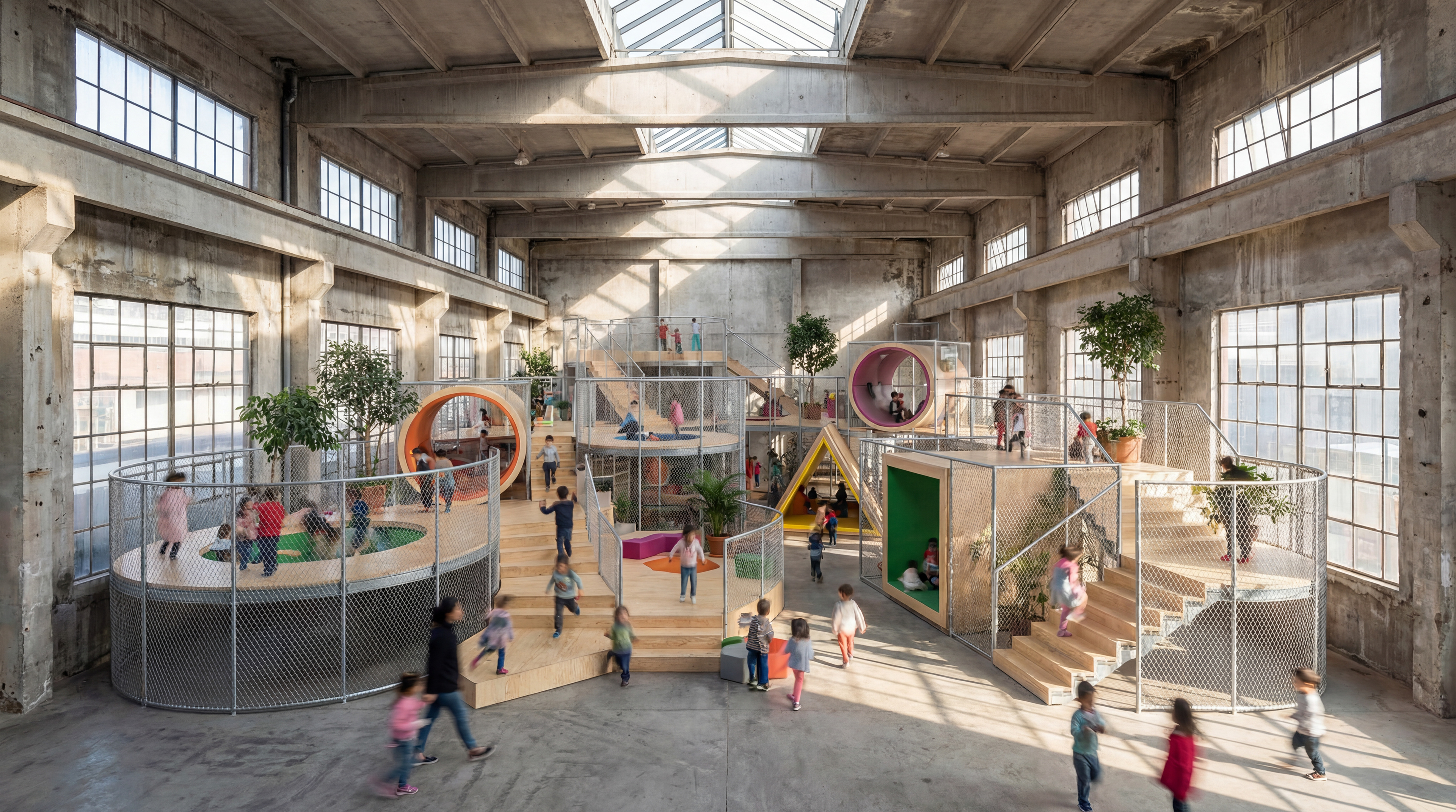 A continuation of the class room project, this project transforms an existing warehouse in the Arts District of Los Angeles into a kindergarten. Inspired by the shape sorting toy, a series of primitively-shaped volumes is inserted into the warehouse, each representing a specific program. Chainlink fence is utilized in various ways with playful geometry throughout the project, framing spaces as roofs, walls, floors and furniture, creating unique spatial qualities for the children to explore and experience.